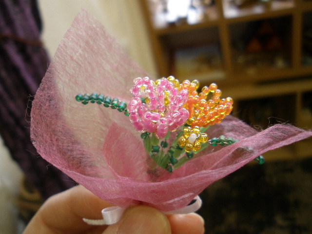 こちらもビーズの花束。リボンも可愛い〜♪